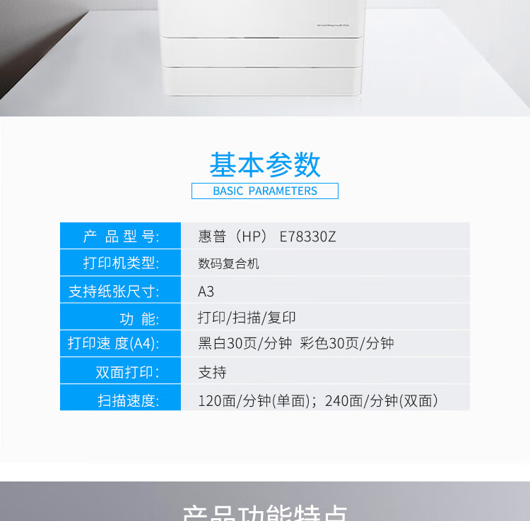 惠普(HP)MFP E78330Z A3彩色数码激光打印机办公 数码复合机 (输稿器+双纸盒)